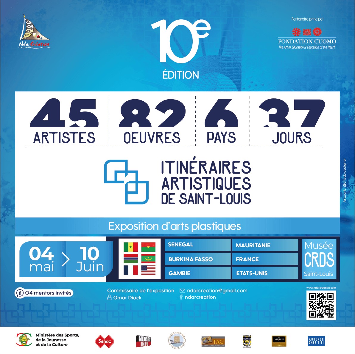 La 10ème édition de l’exposition d’arts plastiques « Les Itinéraires de Saint-Louis » a débuté le 6 mai dernier au Musée CRDS / Centre de recherches et de documentation du Sénégal, à Saint-Louis. Depuis 2020, cet événement annuel bénéficie du soutien de la Fondation Cuomo, son principal mécène.